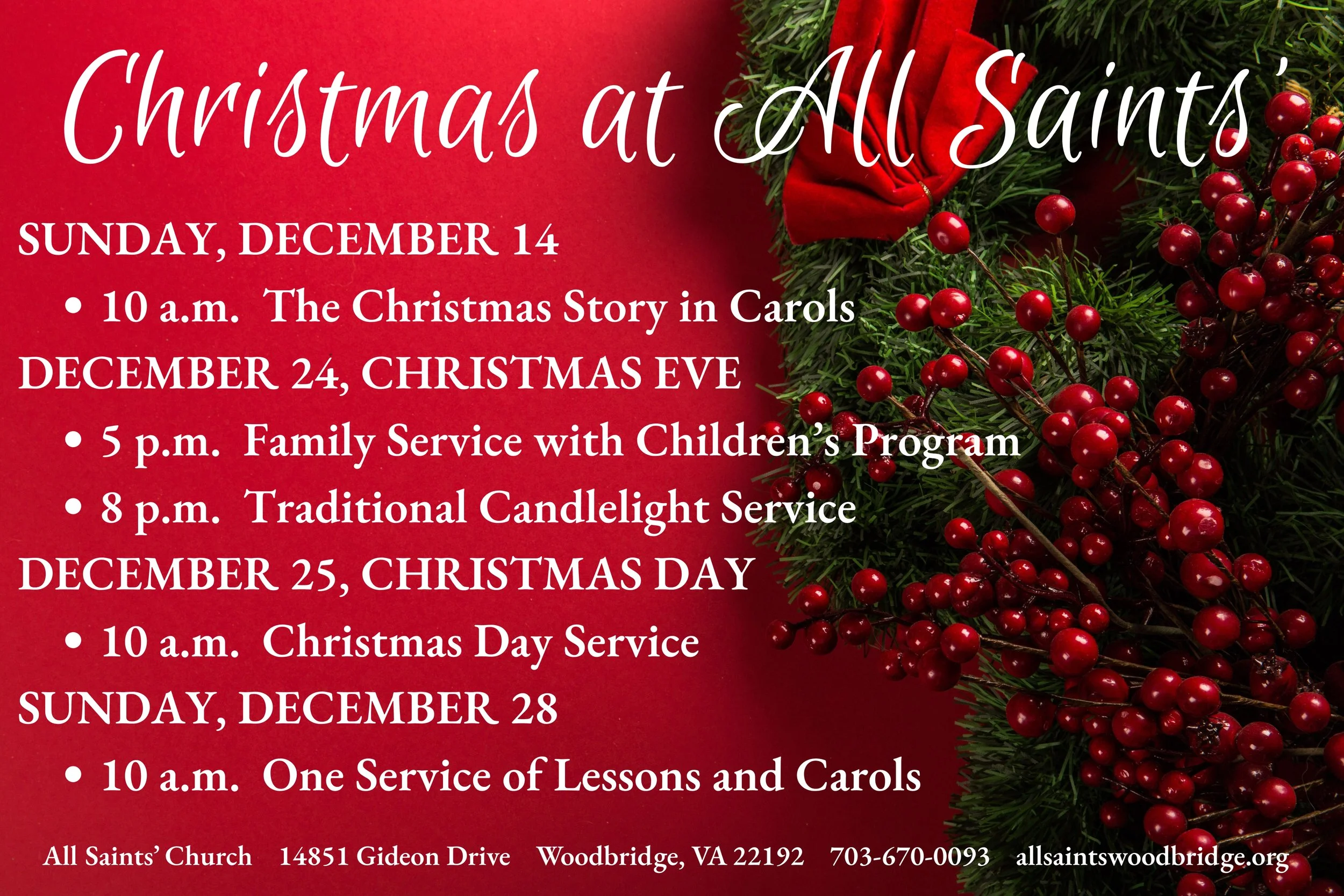 The Sunday after Christmas, December 28, there will be one service of Lessons and Carols at 10 a.m.