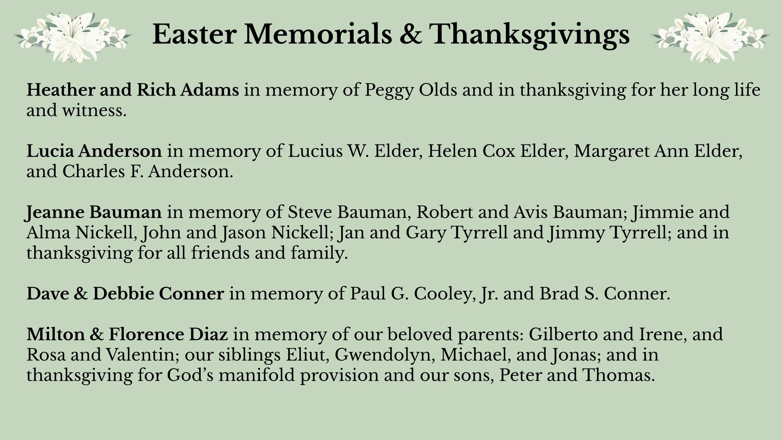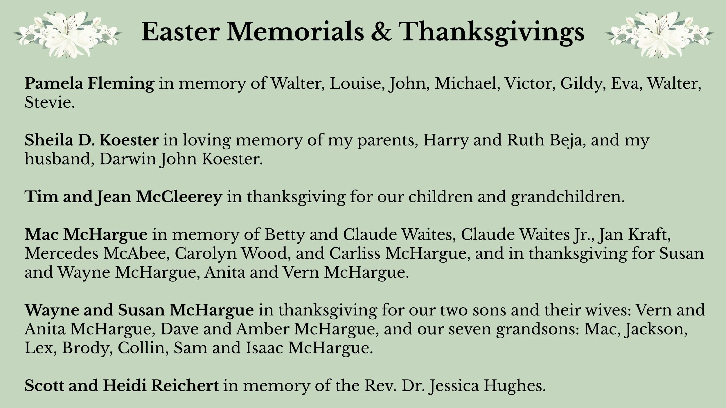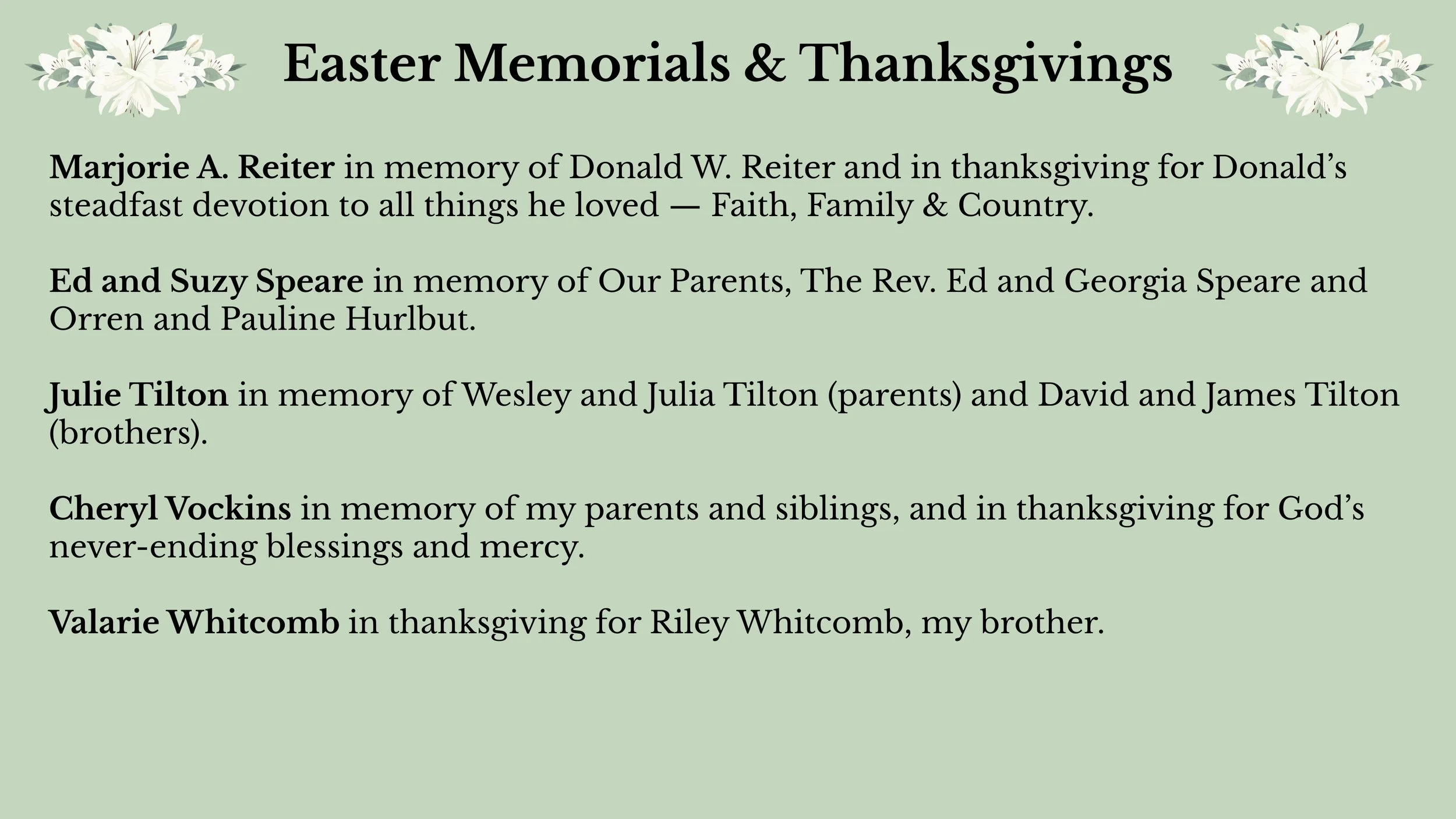 Communications All Saints' April 8, 2026 Easter Memorials and Thanksgivings 2026 Communications All Saints' April 8, 2026 Honoring our loved ones, past and present, with a gift of beauty. printed version available here